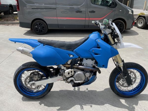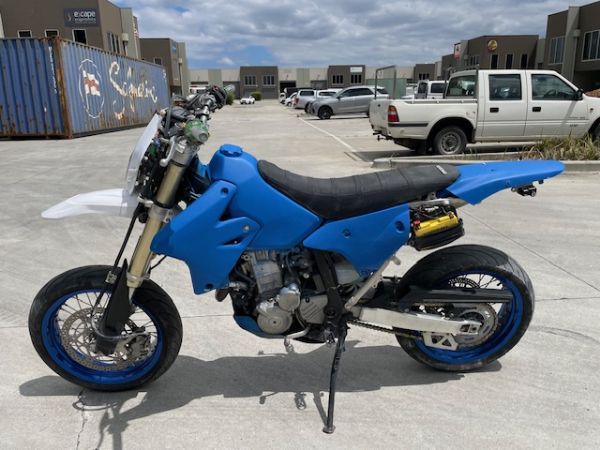 good solid bikes this one has gone for a tumble, frame seems usable but has a hole right side from handlebar end and rest scratched around, forks seem usable but heavily scratched around, wheels seem okay, and okay tyres, has a yoshimura exhaust but damaged, has a super moto exposed right engine cover but scratched.