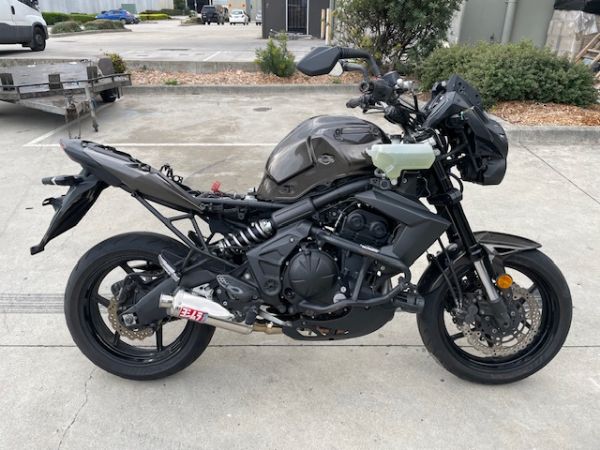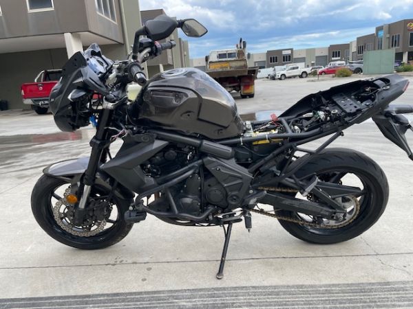 as a guide bike comes as shown no extras,may have been flipped, no dash so not sure on kms, no key just push button start, battery needs charge/replace, all plastics around scratched, right fork scratrched below triple clamps, no headlight, needs right grip/throttle and front brakle lever and fluid reservoir bottle, handlebar scratched at ends, rear subframe twisted/bent and exhaust scratched/dinted, no left side plastic, seat has writing on it, tip of clutch lever and left grip damaged