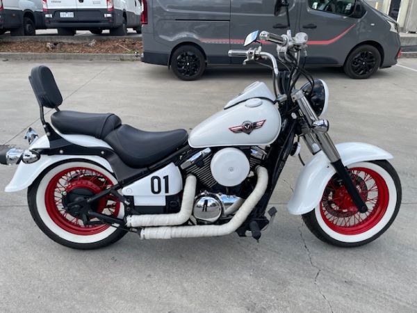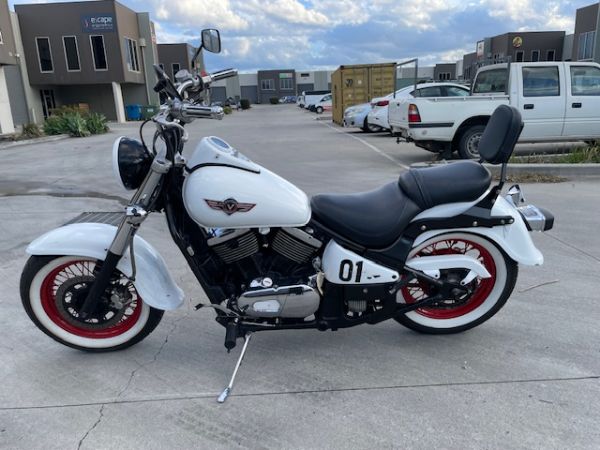 great mid size cruiser, this one should be eligable for club reg too (25 yaers rta), comes with key starts and motor sounds great, frame forks and wheels all seem fine, has aftermarket exhaust, has very good front and rear white wall tyres, as you can see freshly painted and customised