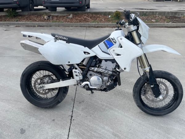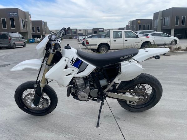 good solid bikes this one has gone for a tumble, frame seems usable but has a hole right side from handlebar end and rest scratched around, forks seem usable but heavily scratched around, wheels seem okay, and okay tyres, has a yoshimura exhaust but damaged, has a super moto exposed right engine cover but scratched.