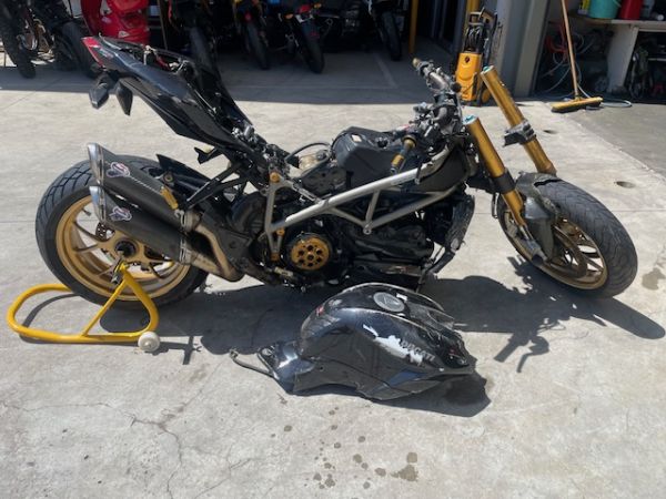 love these bike has 2 of my own, 1098 and the s model, now yes this one is clear title no write off but frame is heavily damaged, this would have been a good clean unit pre-accident, triple clamps all damaged, forks look useable and okay but recocmend check before use (they are scratched) front rim looks okay as well scratched on outer edge (just check befoe use), good back rim with good tyre, has termi carbon pipes scratched, water radiator damaged and oil radiator scratched on sides, tank is damaged, as is airbox, hand controls scratched, handlebar and risers damaged, needs clutch cover and springs, right rider peg/bracket bent/damaged, pillion pegs/bracket scratched, rear fairings scratched, no seats, carbon swingarm cover scratched, left pegs/levers so forth scratched, has some other carbon bits around, bike has key but no head (chip) no dash so not sure on kms, havent started motor but looks useable untested