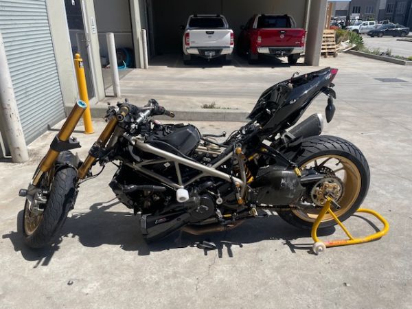 getting harder to find these bikes, this is the base 1198, this was not a crashed bike rather stolen/recovered, has vin number no compliance palte but shouldnt be required as has aus rego histroy (vic-il282), frame forks and wheels all seem fine, just okay front tyre and better rear, has evr pressure plate and clutch cover, has termi slash pippes